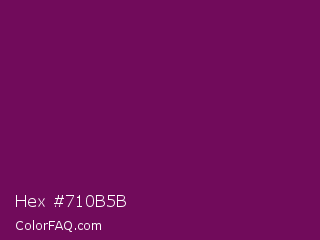Hex #710b5b Color is a dark magenta color and the nearest color is French Plum #811453. Hex code #710b5b and RGB value is rgb(113,11,91). In RGB color space, this color is composed of 44% red, 4% green, 36% blue, In CMYK color space, this color is composed of 0% cyan, 90% magenta, 19% yellow , 56% black , In HSL color space, this color has a hue angle of 313° , 82% saturation and 24% lightness.