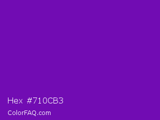 Hex #710cb3 Color is a normal purple color and the nearest color is Violet RYB #8601af. Hex code #710cb3 and RGB value is rgb(113,12,179). In RGB color space, this color is composed of 44% red, 5% green, 70% blue, In CMYK color space, this color is composed of 37% cyan, 93% magenta, 0% yellow , 30% black , In HSL color space, this color has a hue angle of 276° , 87% saturation and 37% lightness.