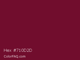 Hex #710d2d Color is a dark rose color and the nearest color is Black Rose #67032d. Hex code #710d2d and RGB value is rgb(113,13,45). In RGB color space, this color is composed of 44% red, 5% green, 18% blue, In CMYK color space, this color is composed of 0% cyan, 88% magenta, 60% yellow , 56% black , In HSL color space, this color has a hue angle of 341° , 79% saturation and 25% lightness.