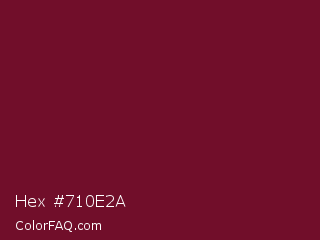 Hex #710e2a Color is a dark rose color and the nearest color is Black Rose #67032d. Hex code #710e2a and RGB value is rgb(113,14,42). In RGB color space, this color is composed of 44% red, 5% green, 16% blue, In CMYK color space, this color is composed of 0% cyan, 88% magenta, 63% yellow , 56% black , In HSL color space, this color has a hue angle of 343° , 78% saturation and 25% lightness.