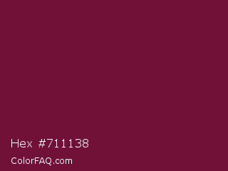 Hex #711138 Color is a dark rose color and the nearest color is Claret #7f1734. Hex code #711138 and RGB value is rgb(113,17,56). In RGB color space, this color is composed of 44% red, 7% green, 22% blue, In CMYK color space, this color is composed of 0% cyan, 85% magenta, 50% yellow , 56% black , In HSL color space, this color has a hue angle of 336° , 74% saturation and 25% lightness.