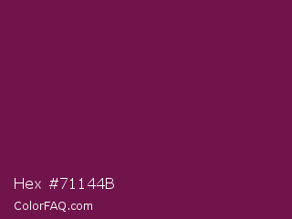 Hex #71144b Color is a dark magenta color and the nearest color is Pansy Purple #78184a. Hex code #71144b and RGB value is rgb(113,20,75). In RGB color space, this color is composed of 44% red, 8% green, 29% blue, In CMYK color space, this color is composed of 0% cyan, 82% magenta, 34% yellow , 56% black , In HSL color space, this color has a hue angle of 325° , 70% saturation and 26% lightness.