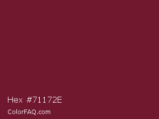 Hex #71172e Color is a dark red color and the nearest color is Claret #7f1734. Hex code #71172e and RGB value is rgb(113,23,46). In RGB color space, this color is composed of 44% red, 9% green, 18% blue, In CMYK color space, this color is composed of 0% cyan, 80% magenta, 59% yellow , 56% black , In HSL color space, this color has a hue angle of 345° , 66% saturation and 27% lightness.