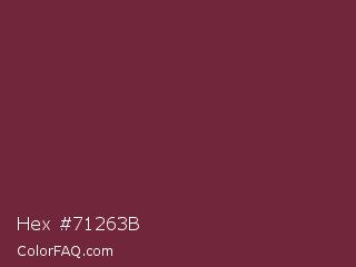 Hex #71263b Color is a dark rose color and the nearest color is Wine #722f37. Hex code #71263b and RGB value is rgb(113,38,59). In RGB color space, this color is composed of 44% red, 15% green, 23% blue, In CMYK color space, this color is composed of 0% cyan, 66% magenta, 48% yellow , 56% black , In HSL color space, this color has a hue angle of 343° , 50% saturation and 30% lightness.