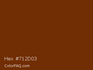Hex #712d03 Color is a dark orange color and the nearest color is Nutmeg Wood Finish #683600. Hex code #712d03 and RGB value is rgb(113,45,3). In RGB color space, this color is composed of 44% red, 18% green, 1% blue, In CMYK color space, this color is composed of 0% cyan, 60% magenta, 97% yellow , 56% black , In HSL color space, this color has a hue angle of 23° , 95% saturation and 23% lightness.