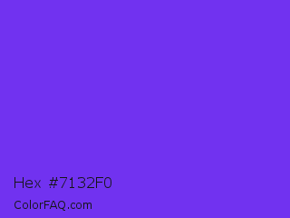 Hex #7132f0 Color is a normal indigo color and the nearest color is Blue Violet #8a2be2. Hex code #7132f0 and RGB value is rgb(113,50,240). In RGB color space, this color is composed of 44% red, 20% green, 94% blue, In CMYK color space, this color is composed of 53% cyan, 79% magenta, 0% yellow , 6% black , In HSL color space, this color has a hue angle of 260° , 86% saturation and 57% lightness.