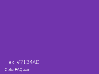 Hex #7134ad Color is a normal violet color and the nearest color is Grape #6f2da8. Hex code #7134ad and RGB value is rgb(113,52,173). In RGB color space, this color is composed of 44% red, 20% green, 68% blue, In CMYK color space, this color is composed of 35% cyan, 70% magenta, 0% yellow , 32% black , In HSL color space, this color has a hue angle of 270° , 54% saturation and 44% lightness.