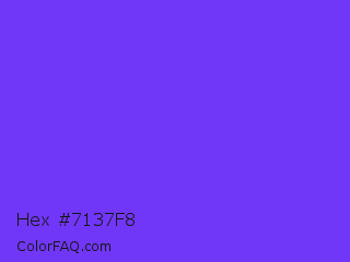 Hex #7137f8 Color is a normal indigo color and the nearest color is Blue Violet #8a2be2. Hex code #7137f8 and RGB value is rgb(113,55,248). In RGB color space, this color is composed of 44% red, 22% green, 97% blue, In CMYK color space, this color is composed of 54% cyan, 78% magenta, 0% yellow , 3% black , In HSL color space, this color has a hue angle of 258° , 93% saturation and 59% lightness.