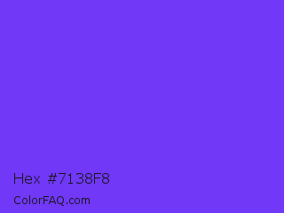 Hex #7138f8 Color is a normal indigo color and the nearest color is Blue Violet #8a2be2. Hex code #7138f8 and RGB value is rgb(113,56,248). In RGB color space, this color is composed of 44% red, 22% green, 97% blue, In CMYK color space, this color is composed of 54% cyan, 77% magenta, 0% yellow , 3% black , In HSL color space, this color has a hue angle of 258° , 93% saturation and 60% lightness.