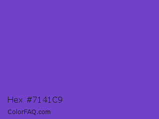 Hex #7141c9 Color is a normal violet color and the nearest color is Purple Heart Crayola #652dc1. Hex code #7141c9 and RGB value is rgb(113,65,201). In RGB color space, this color is composed of 44% red, 25% green, 79% blue, In CMYK color space, this color is composed of 44% cyan, 68% magenta, 0% yellow , 21% black , In HSL color space, this color has a hue angle of 261° , 56% saturation and 52% lightness.