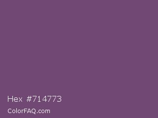 Hex #714773 Color is a normal magenta color and the nearest color is Maximum Purple #733380. Hex code #714773 and RGB value is rgb(113,71,115). In RGB color space, this color is composed of 44% red, 28% green, 45% blue, In CMYK color space, this color is composed of 2% cyan, 38% magenta, 0% yellow , 55% black , In HSL color space, this color has a hue angle of 297° , 24% saturation and 36% lightness.