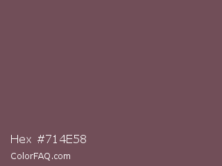 Hex #714e58 Color is a normal rose color and the nearest color is Ferra #704f50. Hex code #714e58 and RGB value is rgb(113,78,88). In RGB color space, this color is composed of 44% red, 31% green, 35% blue, In CMYK color space, this color is composed of 0% cyan, 31% magenta, 22% yellow , 56% black , In HSL color space, this color has a hue angle of 343° , 18% saturation and 37% lightness.