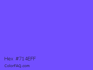 Hex #714eff Color is a light indigo color and the nearest color is Very Light Blue #6666ff. Hex code #714eff and RGB value is rgb(113,78,255). In RGB color space, this color is composed of 44% red, 31% green, 100% blue, In CMYK color space, this color is composed of 56% cyan, 69% magenta, 0% yellow , 0% black , In HSL color space, this color has a hue angle of 252° , 100% saturation and 65% lightness.