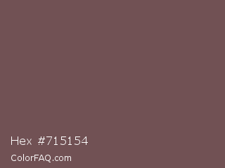 Hex #715154 Color is a normal red color and the nearest color is Ferra #704f50. Hex code #715154 and RGB value is rgb(113,81,84). In RGB color space, this color is composed of 44% red, 32% green, 33% blue, In CMYK color space, this color is composed of 0% cyan, 28% magenta, 26% yellow , 56% black , In HSL color space, this color has a hue angle of 354° , 16% saturation and 38% lightness.