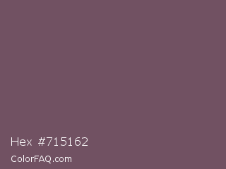 Hex #715162 Color is a normal rose color and the nearest color is Zambezi #685558. Hex code #715162 and RGB value is rgb(113,81,98). In RGB color space, this color is composed of 44% red, 32% green, 38% blue, In CMYK color space, this color is composed of 0% cyan, 28% magenta, 13% yellow , 56% black , In HSL color space, this color has a hue angle of 328° , 16% saturation and 38% lightness.