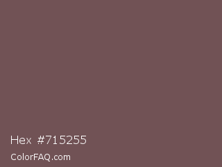 Hex #715255 Color is a normal red color and the nearest color is Ferra #704f50. Hex code #715255 and RGB value is rgb(113,82,85). In RGB color space, this color is composed of 44% red, 32% green, 33% blue, In CMYK color space, this color is composed of 0% cyan, 27% magenta, 25% yellow , 56% black , In HSL color space, this color has a hue angle of 354° , 16% saturation and 38% lightness.