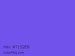 Hex #7152eb Color is a light indigo color and the nearest color is Majorelle Blue #6050dc. Hex code #7152eb and RGB value is rgb(113,82,235). In RGB color space, this color is composed of 44% red, 32% green, 92% blue, In CMYK color space, this color is composed of 52% cyan, 65% magenta, 0% yellow , 8% black , In HSL color space, this color has a hue angle of 252° , 79% saturation and 62% lightness.