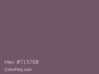 Hex #715768 Color is a normal magenta color and the nearest color is Scorpion #695f62. Hex code #715768 and RGB value is rgb(113,87,104). In RGB color space, this color is composed of 44% red, 34% green, 41% blue, In CMYK color space, this color is composed of 0% cyan, 23% magenta, 8% yellow , 56% black , In HSL color space, this color has a hue angle of 321° , 13% saturation and 39% lightness.