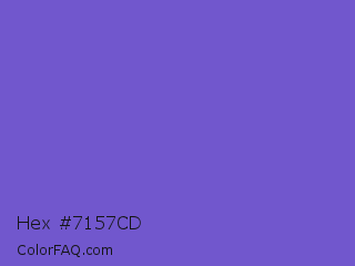 Hex #7157cd Color is a normal indigo color and the nearest color is Slate Blue #6a5acd. Hex code #7157cd and RGB value is rgb(113,87,205). In RGB color space, this color is composed of 44% red, 34% green, 80% blue, In CMYK color space, this color is composed of 45% cyan, 58% magenta, 0% yellow , 20% black , In HSL color space, this color has a hue angle of 253° , 54% saturation and 57% lightness.