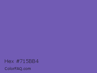 Hex #715bb4 Color is a normal indigo color and the nearest color is Blue Violet #6456b7. Hex code #715bb4 and RGB value is rgb(113,91,180). In RGB color space, this color is composed of 44% red, 36% green, 71% blue, In CMYK color space, this color is composed of 37% cyan, 49% magenta, 0% yellow , 29% black , In HSL color space, this color has a hue angle of 255° , 37% saturation and 53% lightness.