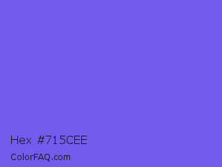 Hex #715cee Color is a light indigo color and the nearest color is Medium Slate Blue #7b68ee. Hex code #715cee and RGB value is rgb(113,92,238). In RGB color space, this color is composed of 44% red, 36% green, 93% blue, In CMYK color space, this color is composed of 53% cyan, 61% magenta, 0% yellow , 7% black , In HSL color space, this color has a hue angle of 249° , 81% saturation and 65% lightness.