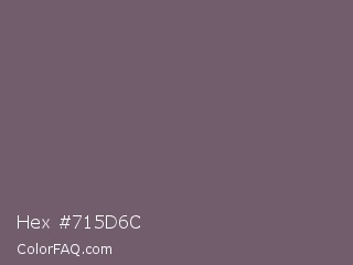 Hex #715d6c Color is a normal magenta color and the nearest color is Salt Box #685e6e. Hex code #715d6c and RGB value is rgb(113,93,108). In RGB color space, this color is composed of 44% red, 36% green, 42% blue, In CMYK color space, this color is composed of 0% cyan, 18% magenta, 4% yellow , 56% black , In HSL color space, this color has a hue angle of 315° , 10% saturation and 40% lightness.