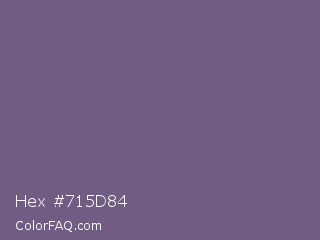 Hex #715d84 Color is a normal purple color and the nearest color is Rum #796989. Hex code #715d84 and RGB value is rgb(113,93,132). In RGB color space, this color is composed of 44% red, 36% green, 52% blue, In CMYK color space, this color is composed of 14% cyan, 30% magenta, 0% yellow , 48% black , In HSL color space, this color has a hue angle of 271° , 17% saturation and 44% lightness.