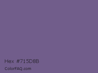 Hex #715d8b Color is a normal violet color and the nearest color is Rum #796989. Hex code #715d8b and RGB value is rgb(113,93,139). In RGB color space, this color is composed of 44% red, 36% green, 55% blue, In CMYK color space, this color is composed of 19% cyan, 33% magenta, 0% yellow , 45% black , In HSL color space, this color has a hue angle of 266° , 20% saturation and 45% lightness.