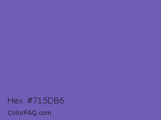Hex #715db6 Color is a normal indigo color and the nearest color is Blue Violet #6456b7. Hex code #715db6 and RGB value is rgb(113,93,182). In RGB color space, this color is composed of 44% red, 36% green, 71% blue, In CMYK color space, this color is composed of 38% cyan, 49% magenta, 0% yellow , 29% black , In HSL color space, this color has a hue angle of 253° , 38% saturation and 54% lightness.