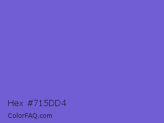 Hex #715dd4 Color is a normal indigo color and the nearest color is Slate Blue #6a5acd. Hex code #715dd4 and RGB value is rgb(113,93,212). In RGB color space, this color is composed of 44% red, 36% green, 83% blue, In CMYK color space, this color is composed of 47% cyan, 56% magenta, 0% yellow , 17% black , In HSL color space, this color has a hue angle of 250° , 58% saturation and 60% lightness.