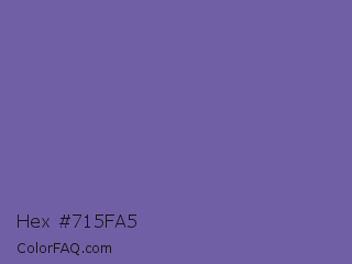 Hex #715fa5 Color is a normal indigo color and the nearest color is Deluge #7563a8. Hex code #715fa5 and RGB value is rgb(113,95,165). In RGB color space, this color is composed of 44% red, 37% green, 65% blue, In CMYK color space, this color is composed of 32% cyan, 42% magenta, 0% yellow , 35% black , In HSL color space, this color has a hue angle of 255° , 28% saturation and 51% lightness.