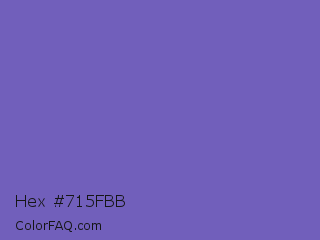 Hex #715fbb Color is a normal indigo color and the nearest color is Fuchsia Blue #7a58c1. Hex code #715fbb and RGB value is rgb(113,95,187). In RGB color space, this color is composed of 44% red, 37% green, 73% blue, In CMYK color space, this color is composed of 40% cyan, 49% magenta, 0% yellow , 27% black , In HSL color space, this color has a hue angle of 252° , 40% saturation and 55% lightness.