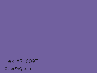 Hex #71609f Color is a normal indigo color and the nearest color is Deluge #7563a8. Hex code #71609f and RGB value is rgb(113,96,159). In RGB color space, this color is composed of 44% red, 38% green, 62% blue, In CMYK color space, this color is composed of 29% cyan, 40% magenta, 0% yellow , 38% black , In HSL color space, this color has a hue angle of 256° , 25% saturation and 50% lightness.