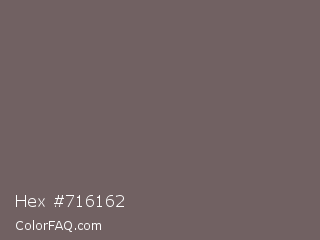 Hex #716162 Color is a normal red color and the nearest color is Scorpion #695f62. Hex code #716162 and RGB value is rgb(113,97,98). In RGB color space, this color is composed of 44% red, 38% green, 38% blue, In CMYK color space, this color is composed of 0% cyan, 14% magenta, 13% yellow , 56% black , In HSL color space, this color has a hue angle of 356° , 8% saturation and 41% lightness.