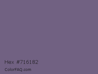 Hex #716182 Color is a normal violet color and the nearest color is Rum #796989. Hex code #716182 and RGB value is rgb(113,97,130). In RGB color space, this color is composed of 44% red, 38% green, 51% blue, In CMYK color space, this color is composed of 13% cyan, 25% magenta, 0% yellow , 49% black , In HSL color space, this color has a hue angle of 269° , 15% saturation and 45% lightness.