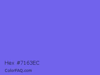 Hex #7163ec Color is a light indigo color and the nearest color is Medium Slate Blue #7b68ee. Hex code #7163ec and RGB value is rgb(113,99,236). In RGB color space, this color is composed of 44% red, 39% green, 93% blue, In CMYK color space, this color is composed of 52% cyan, 58% magenta, 0% yellow , 7% black , In HSL color space, this color has a hue angle of 246° , 78% saturation and 66% lightness.