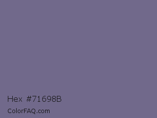 Hex #71698b Color is a normal indigo color and the nearest color is Rum #796989. Hex code #71698b and RGB value is rgb(113,105,139). In RGB color space, this color is composed of 44% red, 41% green, 55% blue, In CMYK color space, this color is composed of 19% cyan, 24% magenta, 0% yellow , 45% black , In HSL color space, this color has a hue angle of 254° , 14% saturation and 48% lightness.