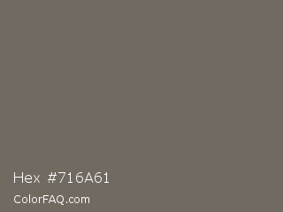 Hex #716a61 Color is a normal orange color and the nearest color is Flint #6f6a61. Hex code #716a61 and RGB value is rgb(113,106,97). In RGB color space, this color is composed of 44% red, 42% green, 38% blue, In CMYK color space, this color is composed of 0% cyan, 6% magenta, 14% yellow , 56% black , In HSL color space, this color has a hue angle of 34° , 8% saturation and 41% lightness.
