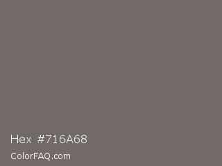 Hex #716a68 Color is a normal red color and the nearest color is Dove Gray #6d6c6c. Hex code #716a68 and RGB value is rgb(113,106,104). In RGB color space, this color is composed of 44% red, 42% green, 41% blue, In CMYK color space, this color is composed of 0% cyan, 6% magenta, 8% yellow , 56% black , In HSL color space, this color has a hue angle of 13° , 4% saturation and 43% lightness.