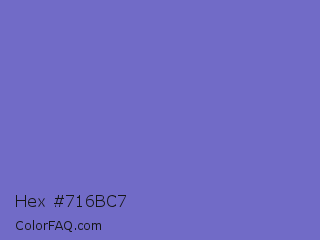 Hex #716bc7 Color is a normal indigo color and the nearest color is Blue Marguerite #7666c6. Hex code #716bc7 and RGB value is rgb(113,107,199). In RGB color space, this color is composed of 44% red, 42% green, 78% blue, In CMYK color space, this color is composed of 43% cyan, 46% magenta, 0% yellow , 22% black , In HSL color space, this color has a hue angle of 244° , 45% saturation and 60% lightness.