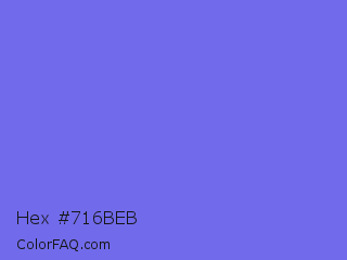 Hex #716beb Color is a light indigo color and the nearest color is Medium Slate Blue #7b68ee. Hex code #716beb and RGB value is rgb(113,107,235). In RGB color space, this color is composed of 44% red, 42% green, 92% blue, In CMYK color space, this color is composed of 52% cyan, 54% magenta, 0% yellow , 8% black , In HSL color space, this color has a hue angle of 243° , 76% saturation and 67% lightness.