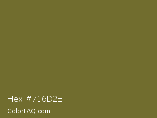 Hex #716d2e Color is a normal yellow color and the nearest color is Crete #737829. Hex code #716d2e and RGB value is rgb(113,109,46). In RGB color space, this color is composed of 44% red, 43% green, 18% blue, In CMYK color space, this color is composed of 0% cyan, 4% magenta, 59% yellow , 56% black , In HSL color space, this color has a hue angle of 56° , 42% saturation and 31% lightness.
