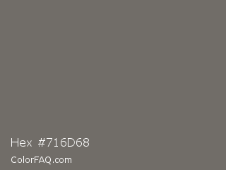 Hex #716d68 Color is a normal orange color and the nearest color is Dove Gray #6d6c6c. Hex code #716d68 and RGB value is rgb(113,109,104). In RGB color space, this color is composed of 44% red, 43% green, 41% blue, In CMYK color space, this color is composed of 0% cyan, 4% magenta, 8% yellow , 56% black , In HSL color space, this color has a hue angle of 33° , 4% saturation and 43% lightness.