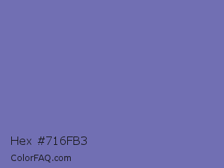 Hex #716fb3 Color is a normal indigo color and the nearest color is Toolbox #746cc0. Hex code #716fb3 and RGB value is rgb(113,111,179). In RGB color space, this color is composed of 44% red, 44% green, 70% blue, In CMYK color space, this color is composed of 37% cyan, 38% magenta, 0% yellow , 30% black , In HSL color space, this color has a hue angle of 242° , 31% saturation and 57% lightness.