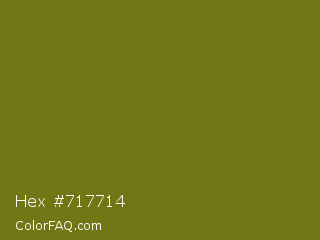 Hex #717714 Color is a dark yellow color and the nearest color is Olivetone #716e10. Hex code #717714 and RGB value is rgb(113,119,20). In RGB color space, this color is composed of 44% red, 47% green, 8% blue, In CMYK color space, this color is composed of 5% cyan, 0% magenta, 83% yellow , 53% black , In HSL color space, this color has a hue angle of 64° , 71% saturation and 27% lightness.