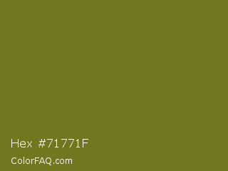 Hex #71771f Color is a dark yellow color and the nearest color is Crete #737829. Hex code #71771f and RGB value is rgb(113,119,31). In RGB color space, this color is composed of 44% red, 47% green, 12% blue, In CMYK color space, this color is composed of 5% cyan, 0% magenta, 74% yellow , 53% black , In HSL color space, this color has a hue angle of 64° , 59% saturation and 29% lightness.