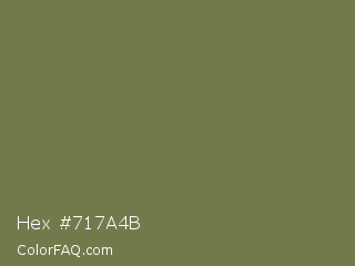 Hex #717a4b Color is a normal lime color and the nearest color is Go Ben #726d4e. Hex code #717a4b and RGB value is rgb(113,122,75). In RGB color space, this color is composed of 44% red, 48% green, 29% blue, In CMYK color space, this color is composed of 7% cyan, 0% magenta, 39% yellow , 52% black , In HSL color space, this color has a hue angle of 71° , 24% saturation and 39% lightness.