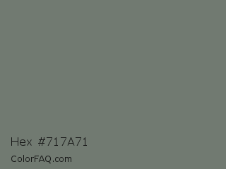 Hex #717a71 Color is a normal green color and the nearest color is Nickel #727472. Hex code #717a71 and RGB value is rgb(113,122,113). In RGB color space, this color is composed of 44% red, 48% green, 44% blue, In CMYK color space, this color is composed of 7% cyan, 0% magenta, 7% yellow , 52% black , In HSL color space, this color has a hue angle of 120° , 4% saturation and 46% lightness.