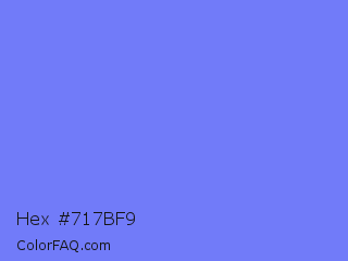 Hex #717bf9 Color is a light blue color and the nearest color is Medium Slate Blue #7b68ee. Hex code #717bf9 and RGB value is rgb(113,123,249). In RGB color space, this color is composed of 44% red, 48% green, 98% blue, In CMYK color space, this color is composed of 55% cyan, 51% magenta, 0% yellow , 2% black , In HSL color space, this color has a hue angle of 236° , 92% saturation and 71% lightness.