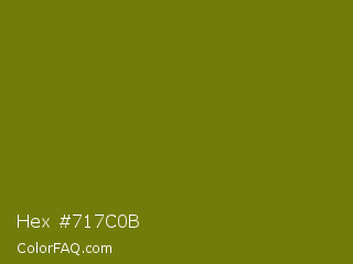 Hex #717c0b Color is a dark yellow color and the nearest color is Olivetone #716e10. Hex code #717c0b and RGB value is rgb(113,124,11). In RGB color space, this color is composed of 44% red, 49% green, 4% blue, In CMYK color space, this color is composed of 9% cyan, 0% magenta, 91% yellow , 51% black , In HSL color space, this color has a hue angle of 66° , 84% saturation and 26% lightness.